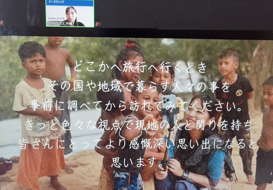 昨年に引き続き、福岡第一高等学校と第一薬科大学付属高等学校2年生(約750名)の皆さま向けに、JPF加盟NGOであるピースウィンズ・ジャパンがオンライン講演を行いました。「自分たちの暮らす地域以外にも興味を持って、学びのある旅にしてほしい」という先生方の思いから、修学旅行の事前学習の一環として開催されたものです。