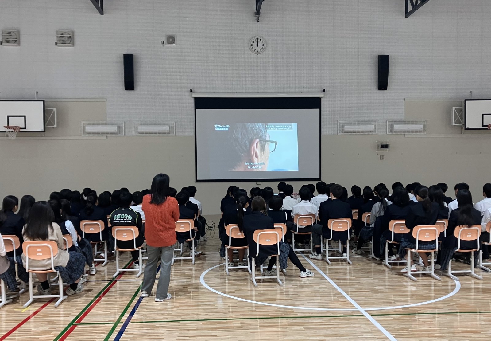 講演の2日前には、忍足さんの国連での活動を追ったドキュメンタリー番組を体育館で視聴しました。生徒の皆さんは、人道支援の現場の映像に引き込まれていました。