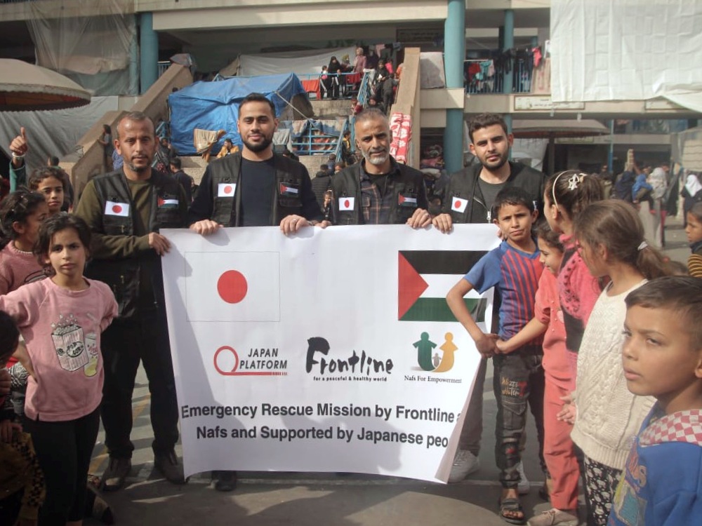 ガザ地区南部ラファ市のエル・ナジャール病院に食料と医薬品を提供し、UNRWA(国連パレスチナ難民救済事業機関)の学校避難所で心理的応急処置を実施。少しでも「安心できる場所」を提供し、PTSD予防につとめました(ガザ人道危機対応支援より)