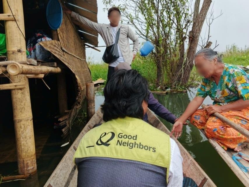 ボートで移動し、被災者から聞き取りを行う/2025.08(加盟NGO提供)
