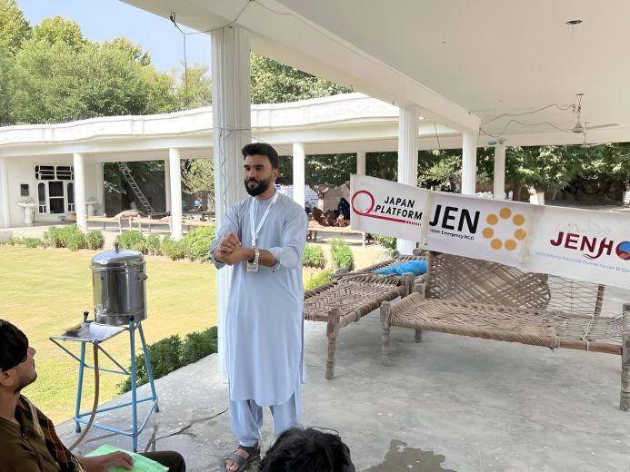 配布会場における男性受益者向け衛生啓発セッションの様子/アフガニスタン・カマ地区/2025.08.06 ©JEN