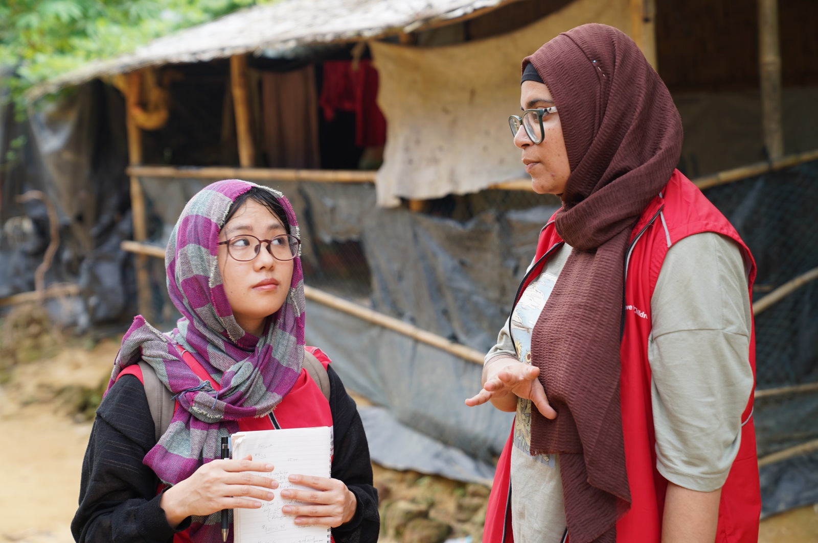 避難民キャンプの取り組みを聞くJPFスタッフ(左)©Save the Children
