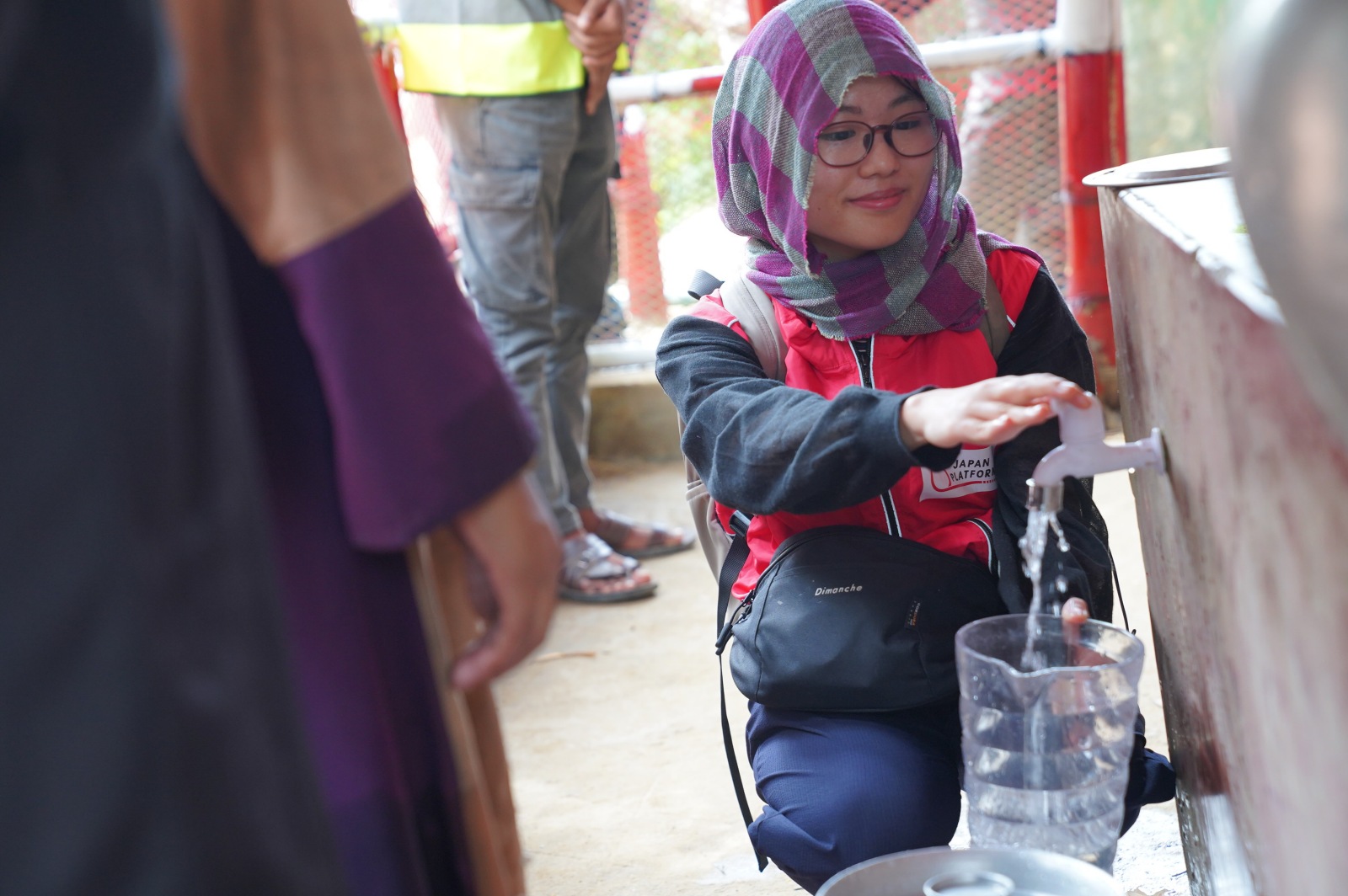 キャンプでは、水場やトイレを共同で使います。そのため、飲料水や生活用水、トイレや下水処理施設などの管理状態は、日々の生活に大きく影響します。このキャンプには傾斜の多い地域があり、高齢者や障がいのある人にとって水くみは大変な作業です。
