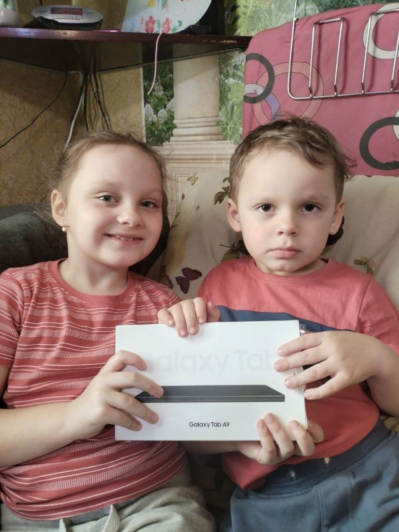 支援を受けた母親の子どもたち。支援で購入した授業用のタブレットを持っている ©Good Neighbors Japan