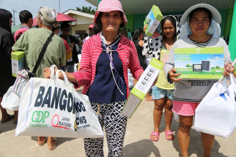 そこで、CWSは厚みのあるタープや、夜間安全に過ごすための太陽光発電電灯、給水所での水くみと保管ができる容器などの支援パックを約3,500世帯に配付しました。配布にあたっては、自らも被災した地元の住民ボランティアの協力もあり、住民登録の確認や受渡の記録、待機する人々の整理などスムーズに行うことができました。