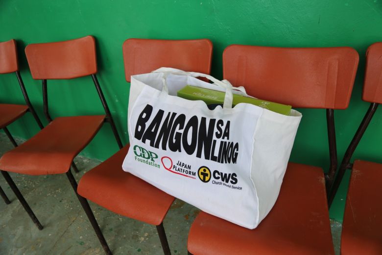 配付物を入れるエコバックには現地語で「Bangon sa Linog(地震から立ちあがろう)」というロゴ入り②/フィリピン・セブ島北部のサンレミジオ町内/2025.11.12 ©️CWS Japan