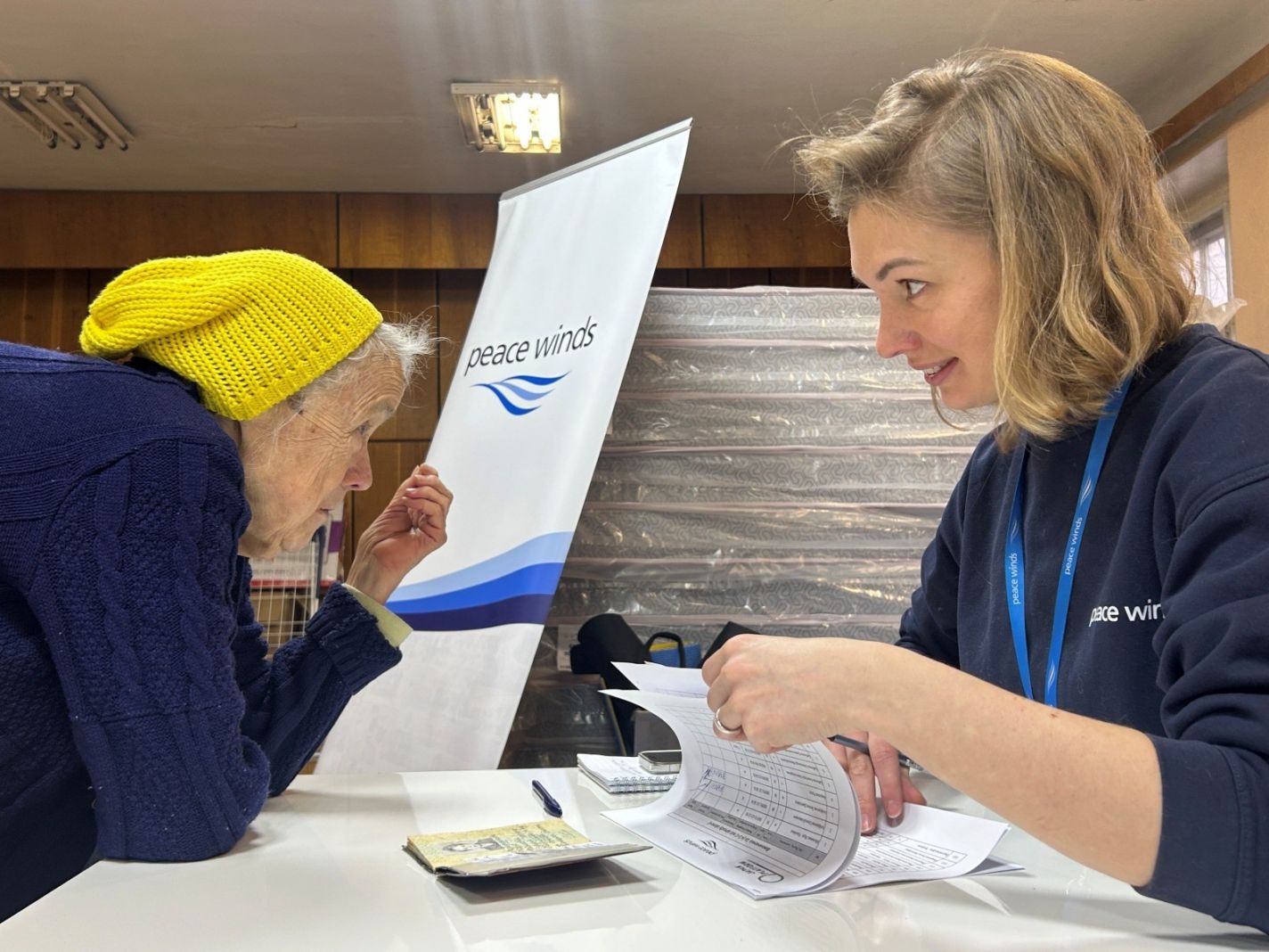 避難所に住む高齢者へのNFI配布登録/ドニプロ市避難所/2025.12 ©ピースウィンズ・ジャパン