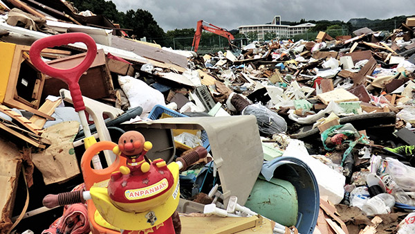 浸水被害を受けて集められた廃棄物。被災地で繰り返される光景。