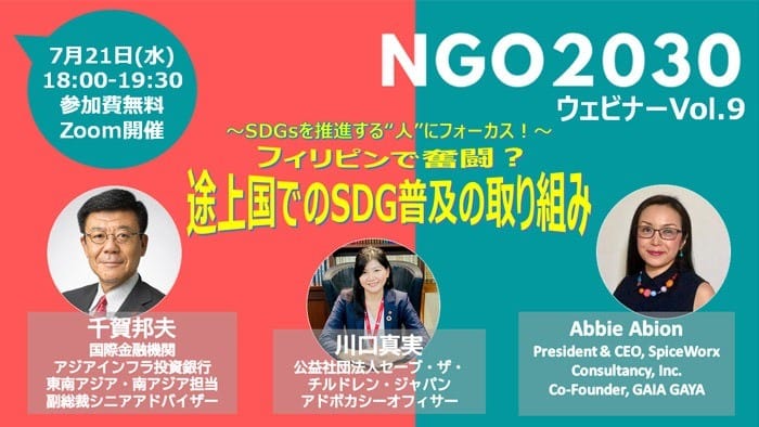 途上国(フィリピン)におけるSDGsの取り組みについて、国際金融機関アジアインフラ投資銀行東南アジア・南アジア担当副総裁のシニアアドバイザーの千賀邦夫氏、またSpiceWorx Consultancy, Inc.社長兼最高経営責任者Abbie Abion氏に、日本の状況との違い、SDGs推進における課題と取り組み、NGOやその他のセクターが果たすべき役割、今後のそれぞれの活動の展望などについてお話いただきます。ファシリテーターはNGO2030の川口が務めます。