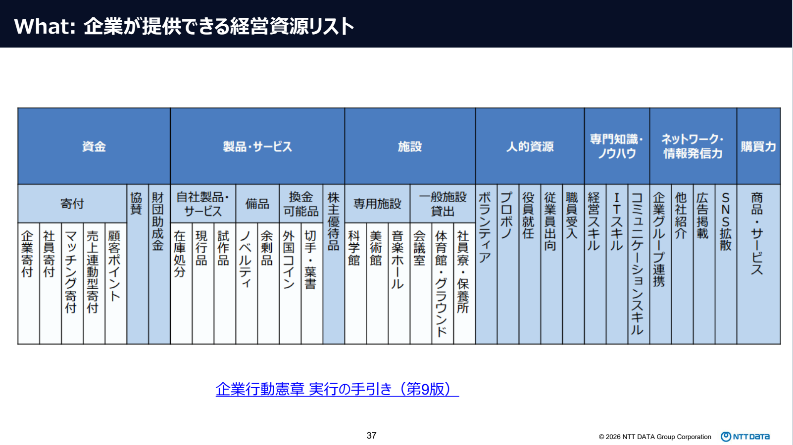 さらに講演では、「社会貢献プログラム策定に向けた6W3Hモデル」が提示され、その中のWhat項目の解説では、企業が社会課題解決に向けて提供できるリソースとして、人材、資金、技術、 製品・サービス、ネットワークなど、多様な経営資源があることが紹介されました。