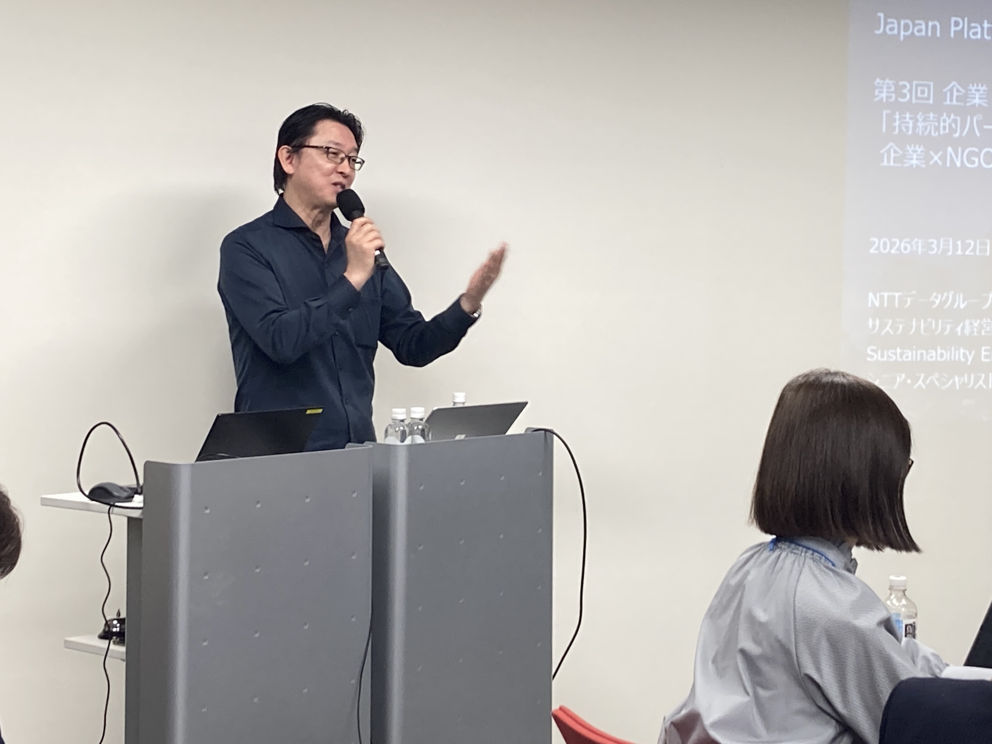 第一部では、NTTデータグループ サステナビリティ経営推進本部 シニア・スペシャリストの金田晃一氏を講師に迎え、「サステナビリティ経営を推進する12ステップモデルから考える、企業×NGO連携の現在地と未来」をテーマに基調講演を行いました。