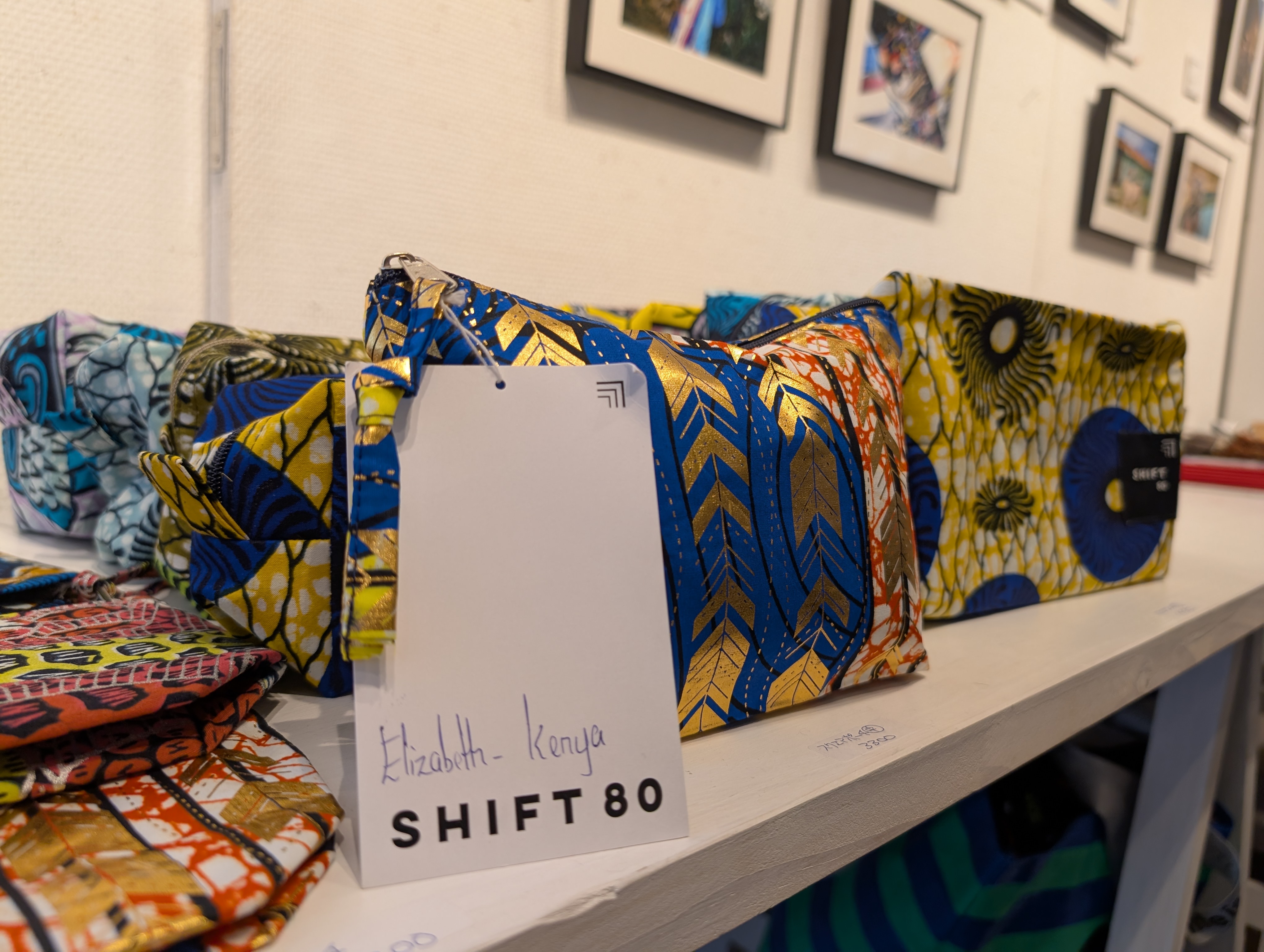 (左)アフリカ難民が制作したポーチには、製作者一人一人の名前が書かれている(SHIFT80)