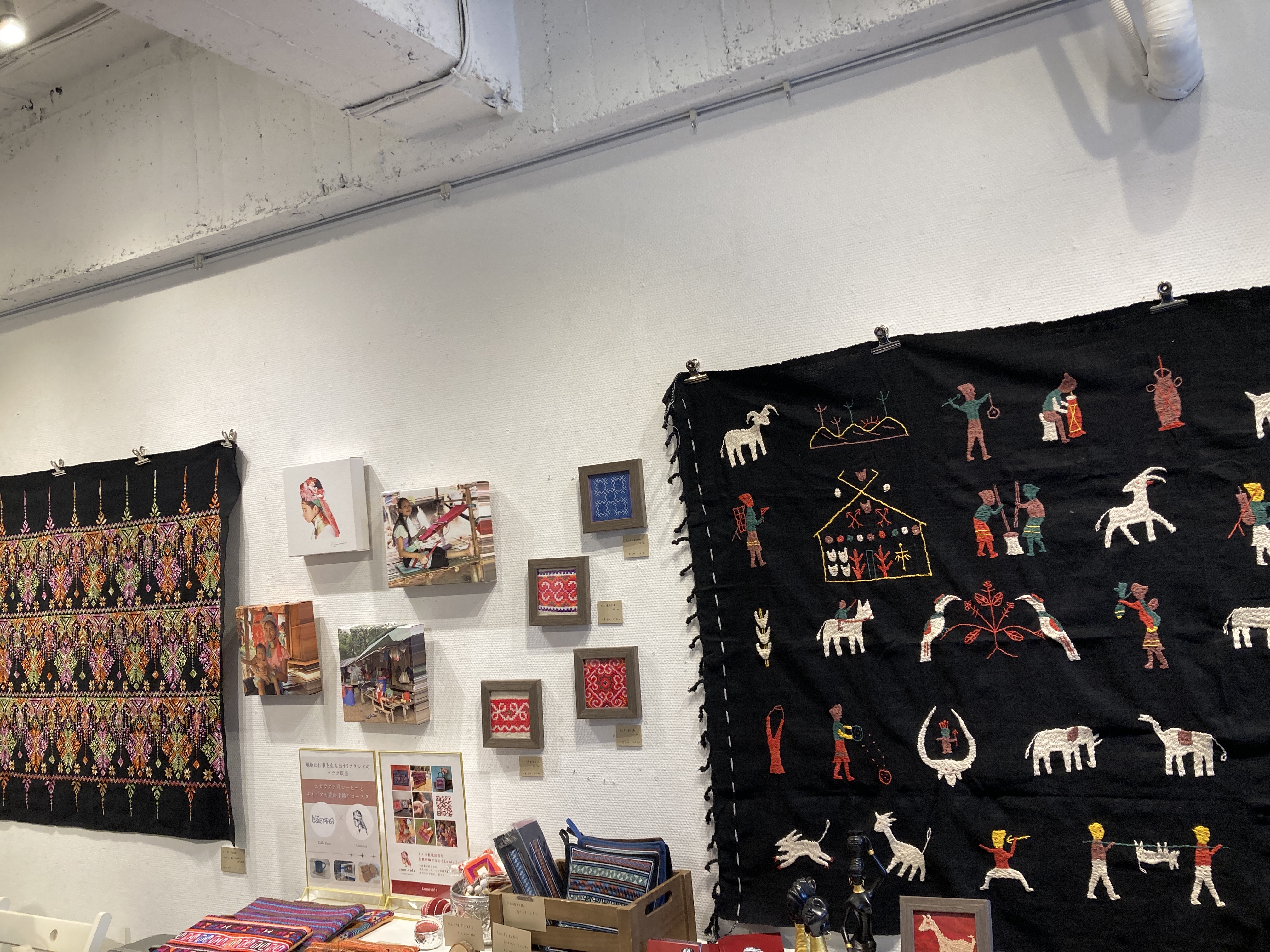 当日はまず展示を拝見し、坂田ミギーさんのブランド「SHIFT80」(アフリカ難民と製作した雑貨などを販売)や、櫻井なほさんのブランド「Lumivida」(タイの少数民族の女性たちが作る伝統刺繍を活かした商品を販売)をはじめ、さまざまな想いのこもった作品に触れました。