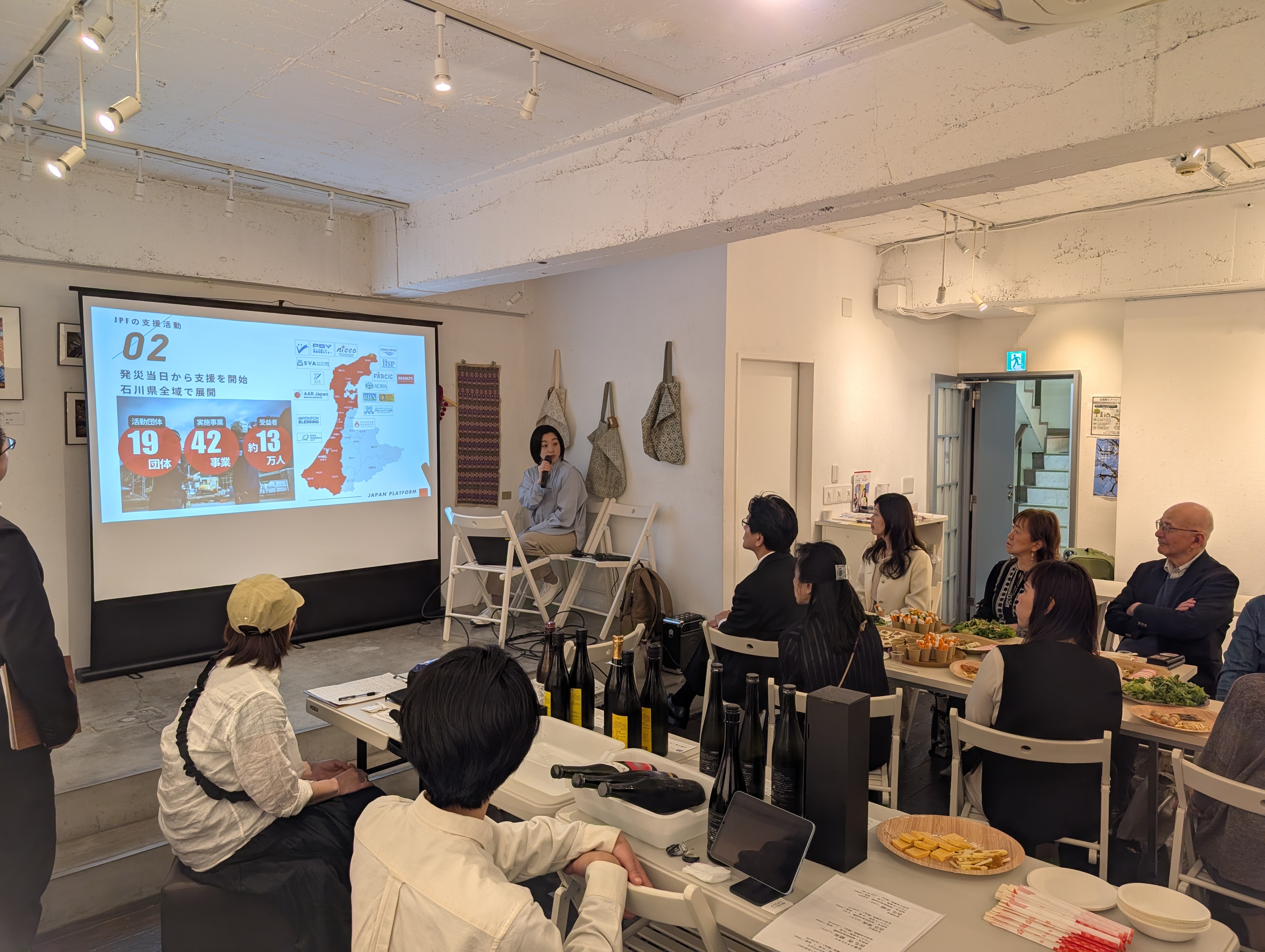 当日は、福岡の天郷醸造所様のクラフトサケと、震災復興の途上にある能登の日本酒を味わいながら、約25名の参加者の皆さまとともに、能登半島における復興支援の現状についてお話する時間となりました。