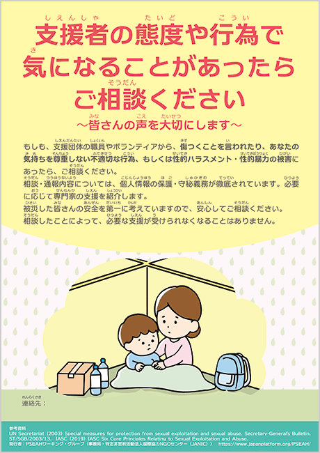 この度、PSEAHワーキング・グループでは啓発フライヤー・ポスターを作成し、PSEAHウェブサイトで公開しました。3種類あり、場所によって使い分けができるようになっています。