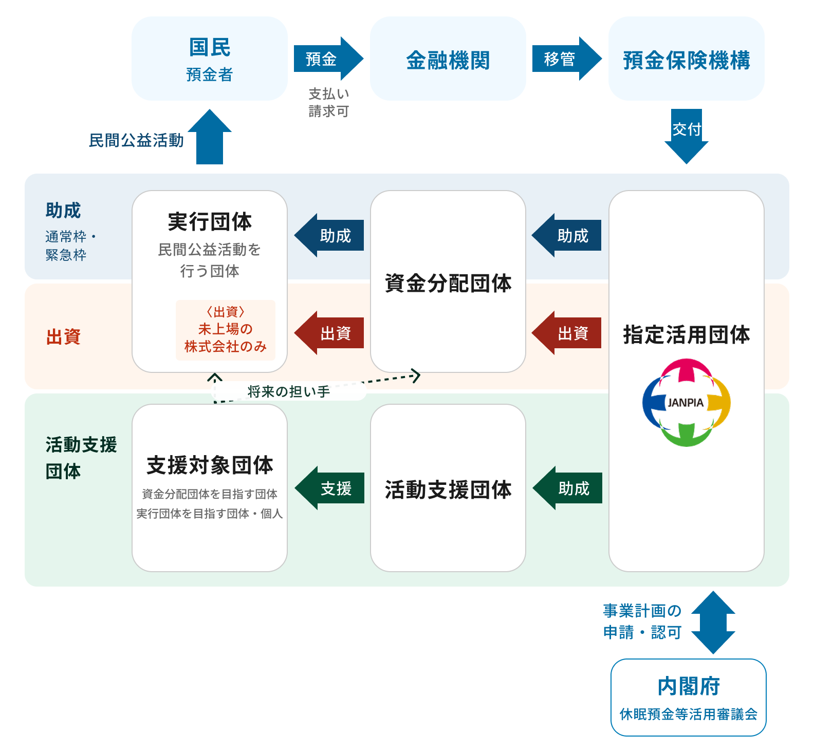 国内災害に起因する、休眠預金等活用法が掲げる公益に資する活動の支援をするのですが、具体的には、JPFとしてどのような事業を行うかを考え、公募に申請します。事業が採択されると、次にそれを実行する団体をJPFで公募し、事業を審査して採択した団体をサポートします。